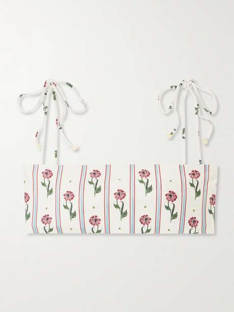 Agua by Agua Bendita's 'Primavera' bikini top celebrates Colombia's lush landscapes. It's made from stretch recycled fabric in a bandeau shape and printed with pretty blooms. Adjust the tie straps to your ideal fit and wear yours with the matching briefs.