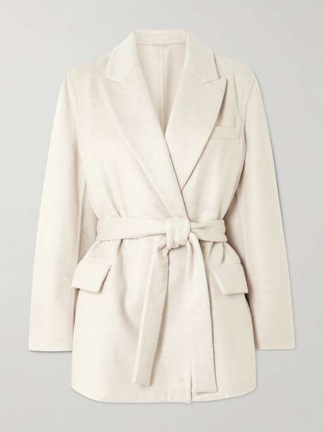 Inspired by knitwear, Brunello Cucinelli's blazer has been made in Italy from wool and has a waist-defining belt. It's detailed with wide peak lapels and flap pockets.