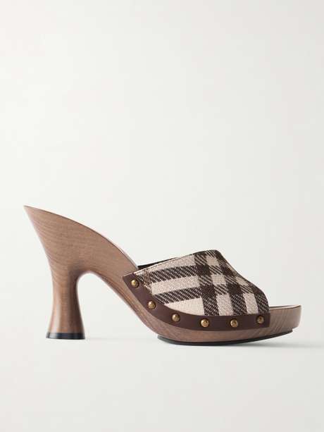 What makes Burberry's 'Le Potter' mules easily recognizable is their signature check made from wool. They feature a substantial wooden platform and heel embellished with antique gold-tone studs. They can be easily styled with shorts and dresses.