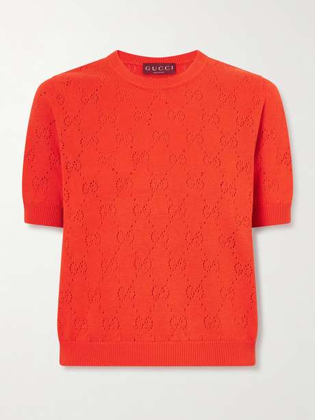Gucci’s sweater is artfully pierced with the label's iconic 'GG' motif. It's knitted from a natural blend of silk and cotton in a lipstick-red hue.