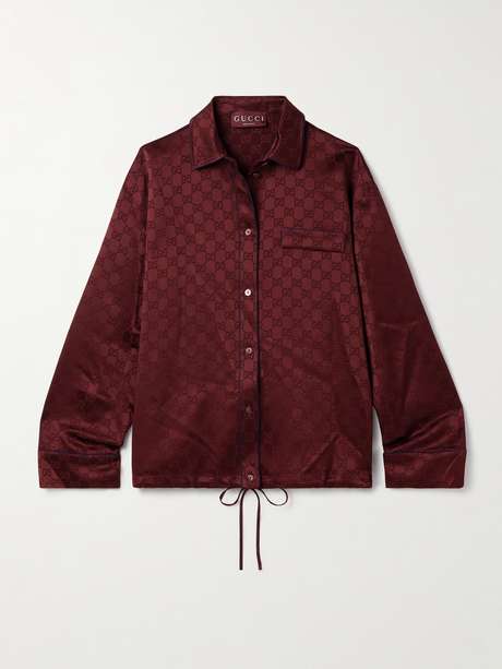 Gucci's shirt evokes luxurious pajamas. It's cut from glossy satin that's jacquard-woven with the brand's 'GG' monogram and traced with contrasting crepe piping. Adjust the ties along the hem to temper the loose shape.