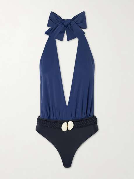 Johanna Ortiz' 'Seashell Hunting' swimsuit is named after the glossy shells detailing the braided belt at the waist. Made from recycled stretch-fabric, it has a ruched bodice with a plunging halter neckline and high-cut legs that create an elongating effect. Pack it for your next beach getaway.