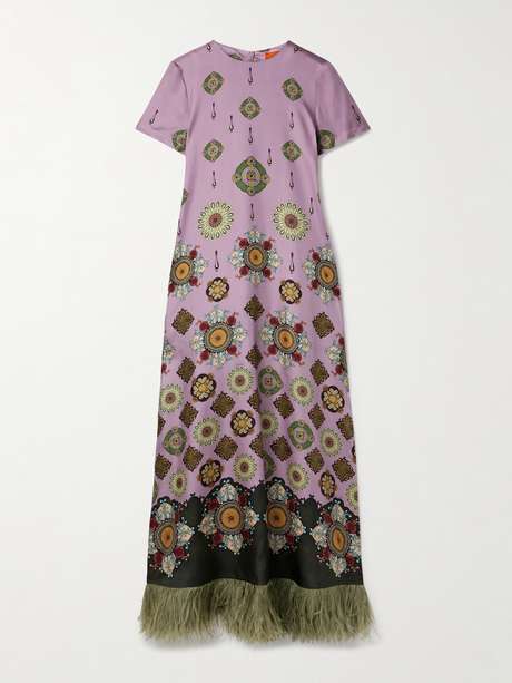 Loved for its easy T-shirt shape, La DoubleJ’s 'Swing' dress was the very first silhouette the brand introduced. This fluid silk-twill version is updated with feathers along the maxi hem for a glamorous, vintage-inspired look. Complement the ornate print with statement gold jewelry.