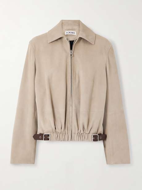 Loewe's Harrington jacket has been expertly made in Spain from panels of supple suede in a neutral beige that's so easy to style. It has a loose shape, zipped cuffs and leather buckles at the partially elasticated hem.
