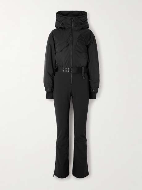 Moncler Grenoble's technological skiwear enhances your performance on the slopes without sacrificing style. This ski suit has a padded shell jacket with a generous stand collar and hood to protect against the elements. The slim pants are made with plenty of stretch and have zipped sides to fit over your snow boots.