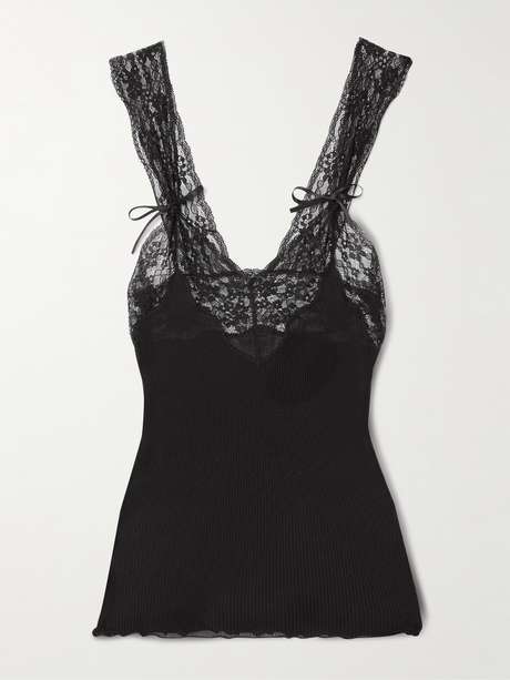 Lingerie dressing is big this season and SAINT LAURENT's tank makes a sultry statement. It's made from ribbed silk and framed with sheer lace topped and sweet bows. Wear yours with a pencil skirt and oversized leather jacket.