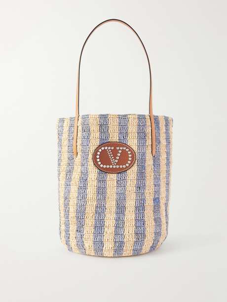 VALENTINO GARAVANI Vlogo Signature small embellished leather-trimmed striped raffia bucket bag