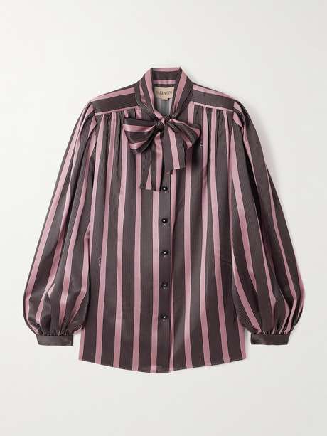 Valentino Garavani's blouse was worn on the Fall '25 runway, which illustrated Alessandro Michele's artistic expression. Made from silk-satin, it's patterned with narrow stripes, some broken up with the house logo, and has a maximalist pussy-bow neckline.
