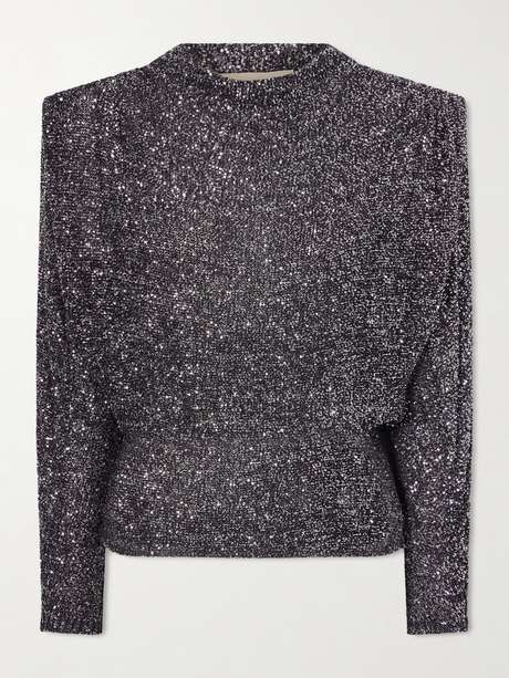 Valentino Garavani pairs couture craftsmanship with striking, modern silhouettes in this blouse. Crafted from lace densely embellished with shimmering sequins, it catches the light with a luminous texture. Padded shoulders balance the relaxed fit, while a softly draped neckline adds fluidity to the design.