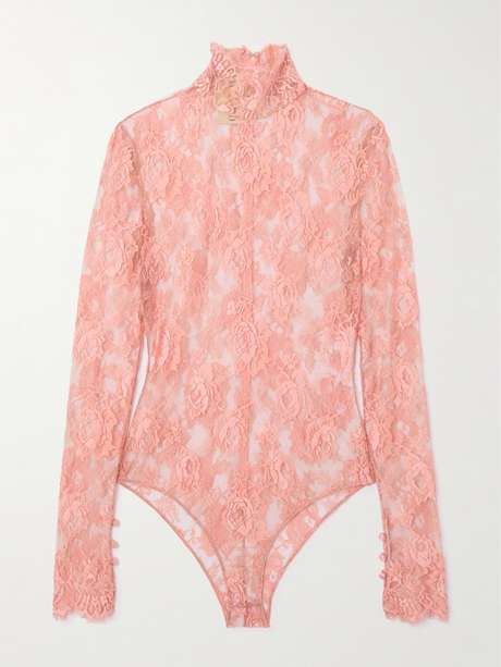 Valentino Garavani's bodysuit is cut from delicate floral stretch-lace that dominated the brand's Fall '25 runway. Designed with a high turtleneck, it reveals glimpses of skin through the intricate pattern - underpin yours with a tonal bra.
