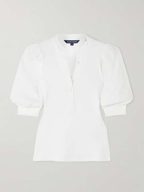 Veronica Beard's 'Coralee' top is made from ribbed stretch Pima cotton-jersey with smooth poplin along the sleeves, crew neck and placket. It has a slim fit and tucks nicely into jeans or tailoring.