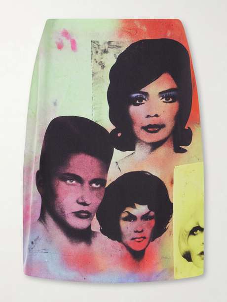 Versace spotlights bold artistry with this silk twill pencil midi skirt. Printed with 'The Party' motif, it features anonymous faces rendered in saturated primary hues, creating a striking graphic effect against the fluid, streamlined silhouette.