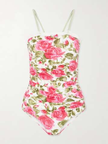 Bow-detailed ruched lace-trimmed floral-print swimsuit