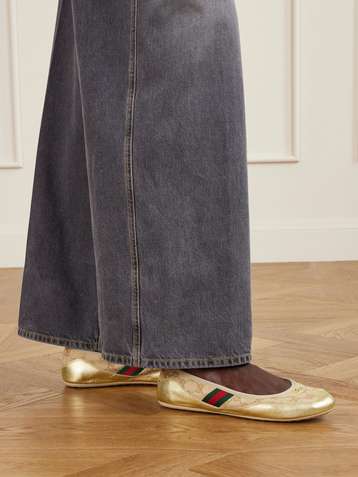 Shift webbing-trimmed canvas-jacquard and metallic leather ballet flats