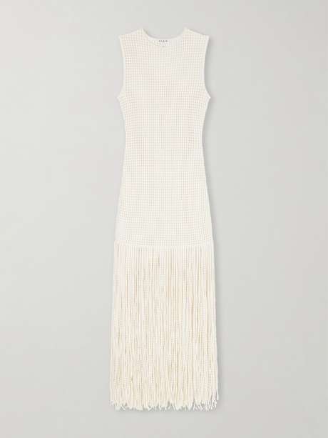 Restraint and expression converge through refined craft in Alaïa Spring ’26. Open-knitted, this dress is fitted from the high neckline to the hips before falling in cascading tassels that resemble strands swaying beautifully with you.