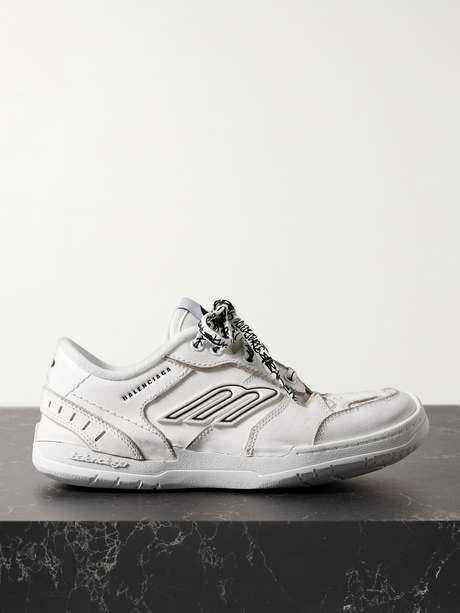 Balenciaga’s chunky ‘Hamptons’ sneakers resemble a pair that’s been loved for years. Made from scuffed leather, they have rubberized logos and laces complete with ‘scribble’ motifs.