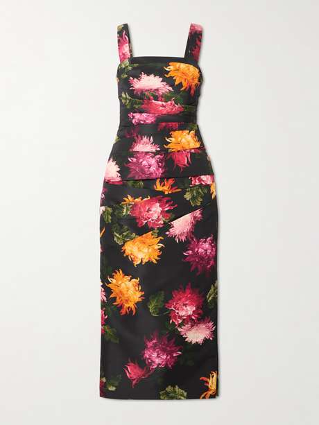 Carolina Herrera's Fall '25 collection shows that florals can work just as well in fall as they do in spring. Printed with colorful blooms, this dress is cut from faille and has a draped front.