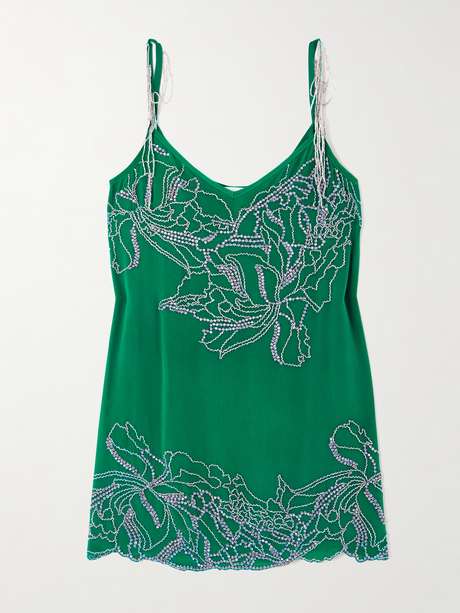 Dries Van Noten's camisole is decorated with tiny beads and crystals arranged in an abstract floral motif outlined by blue embroidery. Made from lightweight silk-crepe, it has a relaxed fit with an asymmetric hem and fringe cascading from the slim straps.