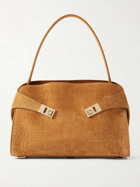 FERRAGAMO Hug small embellished croc-effect suede tote