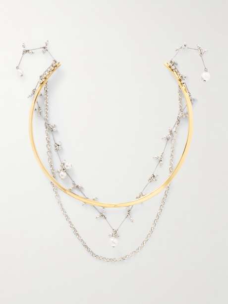 Isabel Marant's 'Freya' necklace is designed to resemble a trio of styles layered together. It has a round gold-tone choker and two draped, silver-tone chains.