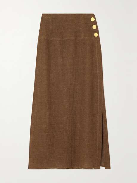 Parisian label Le Kasha works exclusively with natural fabrics that look as good as they feel. This 'Haifa' maxi skirt has been made in France from organic linen for lightness and has a deep thigh split along one side. Match your earrings to the coin-like buttons.