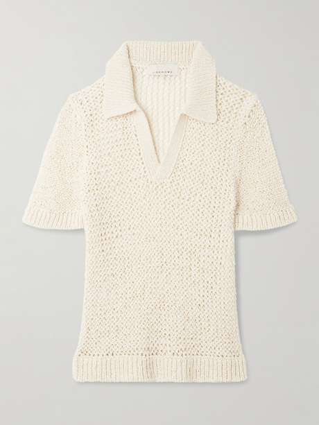 LIBEROWE's polo sweater has an open-knit texture that's airy and sheer. Unfettered by fastenings, the whole design reads elegantly streamlined.