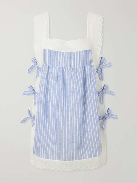 LORETTA CAPONI Fiocchini bow-embellished striped broderie anglaise-trimmed linen mini dress