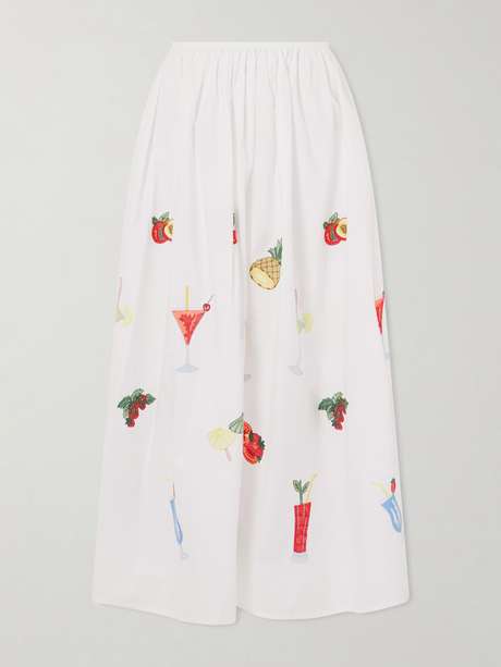 Loretta Caponi’s ‘Talamone’ skirt exudes elegance with a playful twist. Crafted from breezy cotton poplin, it features soft pleats adorned with charming fruit and cocktail embroideries, creating a fun, summery vibe. Pair it with a simple top to let the skirt take center stage.