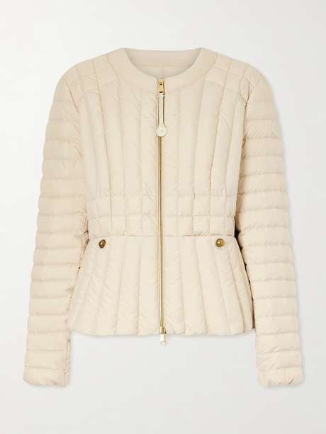 Moncler's 'Menthe' jacket is such an elegant way to keep cozy. Made from shell that's quilted and filled with insulating down, it has burnished gold-tone hardware and fits close through the waist before flaring out to a peplum hem. Notice how the sleeve is appliquéd with the label's logo patch.