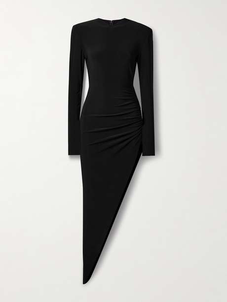 When it comes to striking yet simple eveningwear, Norma Kamali is an expert. Cut from black stretch-jersey, this dress is ruched along the side and falls to an asymmetric hem. The subtle V-neckline is framed by angular shoulder pads.