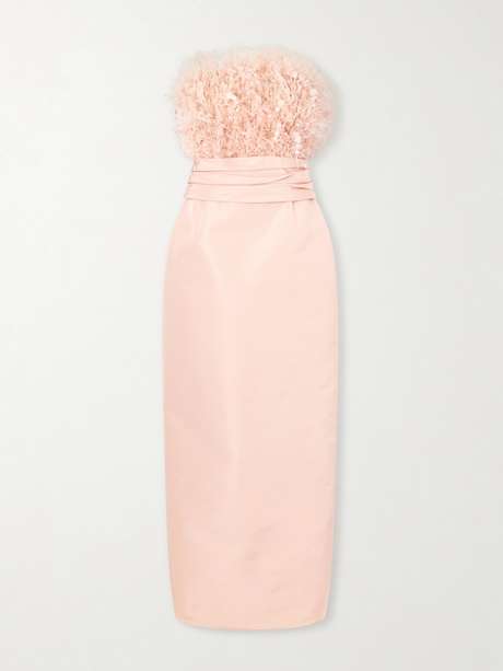 OSCAR DE LA RENTA Point d’Esprit strapless embellished feather-trimmed silk-faille gown