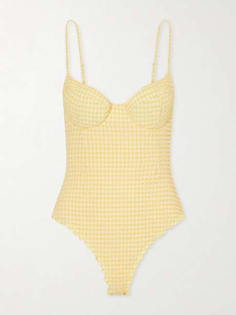 Simkhai's 'Suni' swimsuit is made from quick-drying stretch fabric that skims the body. It has a sweetheart neckline with slim straps and comes in a vibrant 'Mango' yellow shade with a checked pattern.