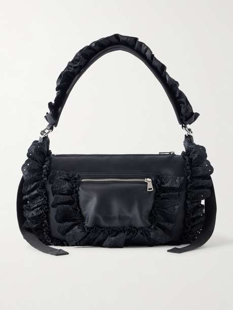 Simone Rocha's shoulder bag imitates a pillowcase courtesy of the ruffled border. Made from versatile black shell, it has a zipped front pocket and is trimmed with broderie anglaise. Slot your keys, cardholder and phone inside.