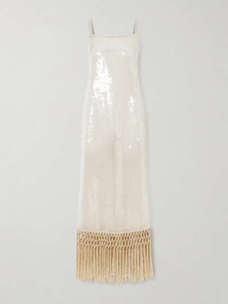 Taller Marmo's 'Agrigento Disco' gown is designed with summer soirées in mind. Made from cotton with a mesh-like handle, it's embellished with sparkling sequins and has a loose shape with hand-tied fringing that swishes as you walk or dance.