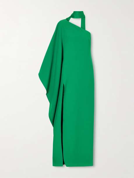 Crafted from a single panel of crepe-cady, Taller Marmo’s ‘Paloma’ gown drapes fluidly through the body for a liquid, sculptural effect. A scarf-like tie frames the one-shoulder neckline before cascading into a dramatic cape-effect sleeve, while a high slit enhances movement.