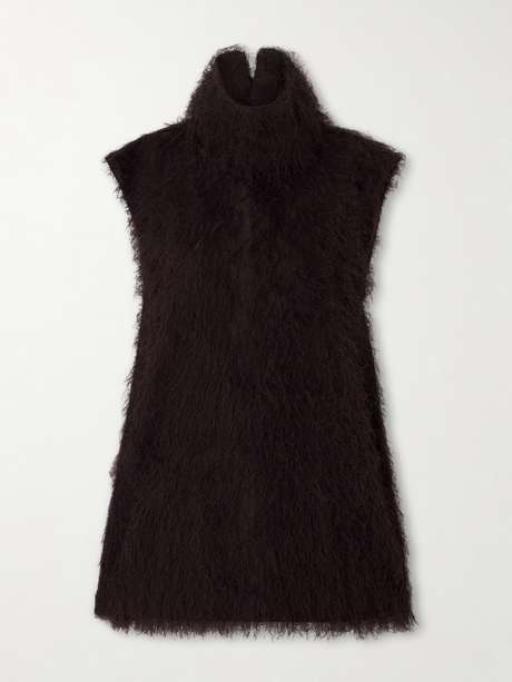 The Frankie Shop's 'Lancy' dress is minimal in shape but maximal in impact. Cut from shell covered in soft, tactile fringing, it has a sculptural turtleneck and a straight fit through the body. Style yours with knee boots.