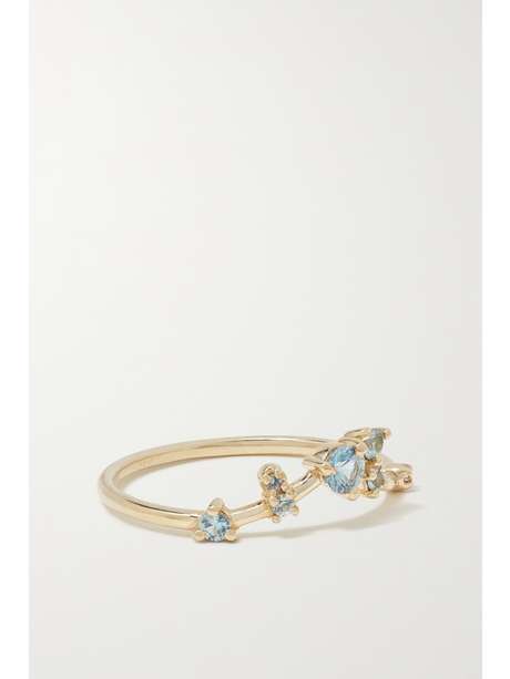 Wwake's ring is dusted with shimmery sapphires and a diamond carefully arranged to depict stars in the night sky. The slim band has been hand-cast in the label's NYC studio from recycled gold. Wear yours with similar pieces.
