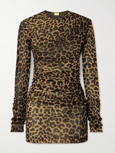 SAINT LAURENTLeopard-print ruched mesh mini dress