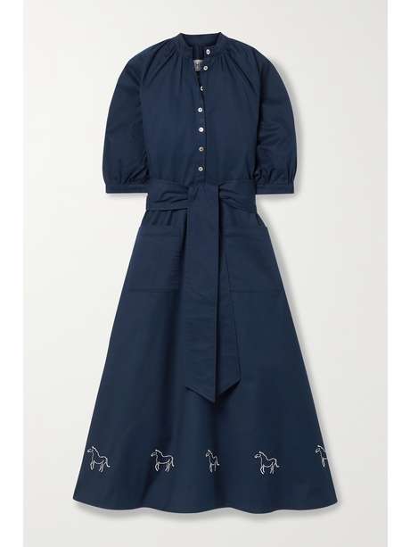 Inspired by gauchos and South America’s equestrian heritage, the Argentinian designers behind Àcheval Pampa are dedicated to supporting local artisans and traditional craftsmanship. This aptly named 'Argentina' dress is made from upcycled navy cotton-blend embroidered with trotting horses along the hem. Leave a few of the mother-of-pearl buttons undone and cinch your waist using the sash if you prefer a little more definition.