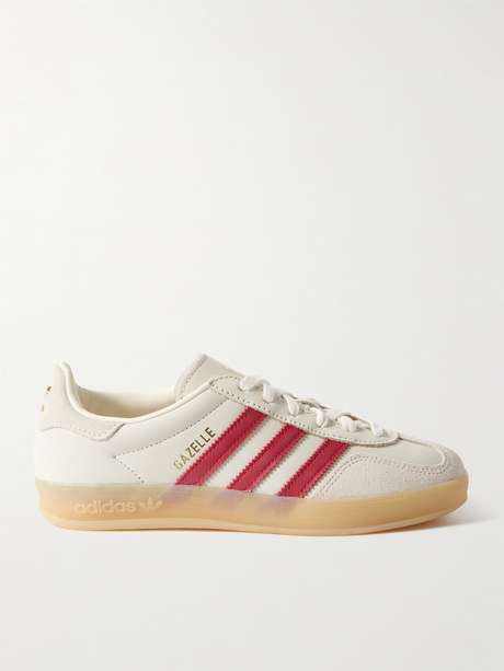 adidas Originals' 'Gazelle Indoor' sneakers were initially released in the '70s as an indoor sports shoe and have since grown to become an iconic streetwear staple. This iteration is made from leather and suede with red stripes and gummed rubber soles.