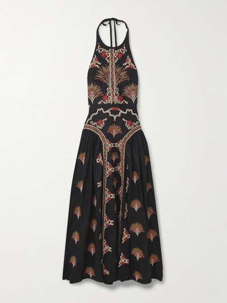 AGUA BY AGUA BENDITA Balsa pleated embroidered linen halterneck midi dress