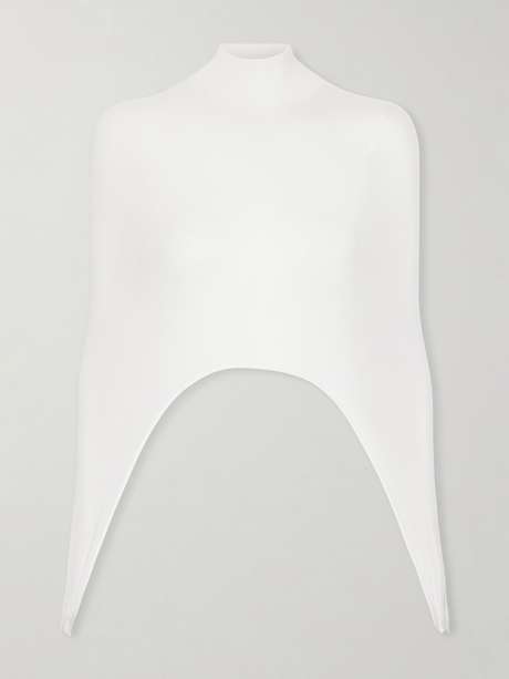Restraint and expression converge through refined craft in Alaïa Spring ’26. Knitted from silk-blend with a hint of stretch, this 'Bat' top is skin-tight, following the natural lines of the body, and has finger loop sleeves. Reference the SS26 runway and wear yours over a voluminous skirt.