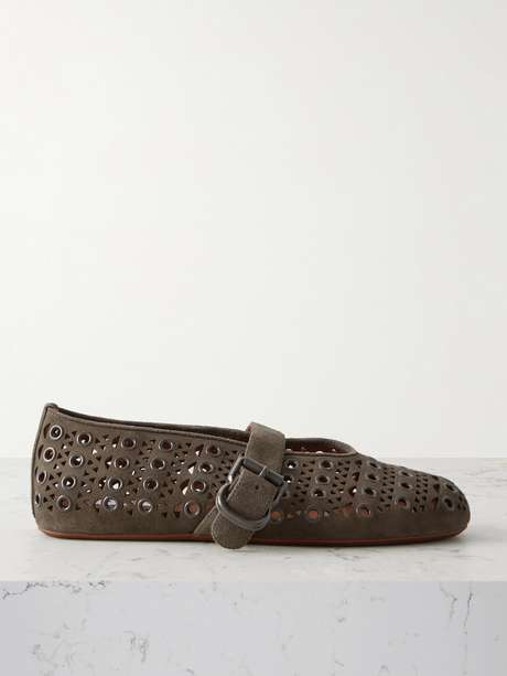 Alaïa's ballet flats are perforated with the signature 'Vienne' motif and embellished with silver-tone eyelets. Made from velvety suede, they have rounded toes and buckle-fastening straps. Wear yours with jeans or mini skirts.