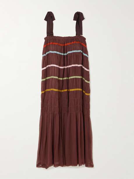 Alix of Bohemia's 'Emrys Clove Aurora' is patterned with rainbow stripes that add such character. Made from gauze, it's gathered for texture and falls in loose, straight tiers. Knot the straps into pretty bows.