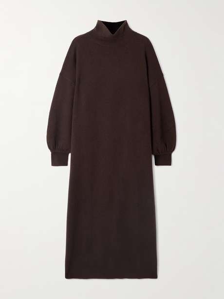 Allude's dress is chic, comfortable and cozy. It's knitted from wool and cashmere-blend in a relaxed, column-like shape with a turtleneck collar. We love the dropped shoulders and blouson sleeves, too.