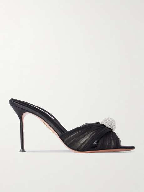 AQUAZZURA Mystery 85 crystal-embellished leather-trimmed chiffon mules