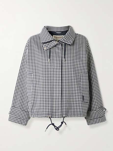Barbour's 'Bronwyn' jacket adds a playful touch to traditional rainwear. Cut from shower-proof twill, it has drawstring ties at the hem, as well as the oversized funnel neck. Match the rest of your outfit to the navy and white checks.
