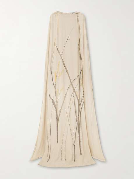 BERNADETTE's 'Minnie' gown has seen many stylish iterations, and this wheat-print version will be a beautiful addition to your spring edit. Made from crepe de chine, it has a cape-effect overlay and is embellished with sequins by hand.