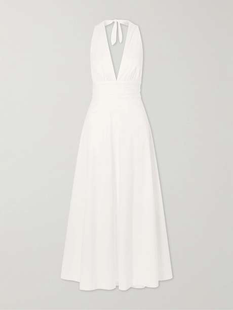 BERNADETTE's dress is inspired by the elegant styles worn by the iconic actress Marilyn Monroe. Made from cotton-blend poplin, the halterneck bodice cinches in at the waist before falling to a floor-skimming hem.