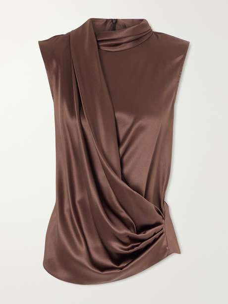 BRUNELLO CUCINELLI Wrap-effect sleeveless draped silk-blend satin blouse